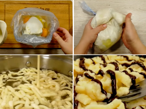 Сразу ставим на огонь кастрюлю с водой. Берем плотный полиэтиленовый кулек и укладываем его в мисочку, затем все ингредиенты отправляем в этот кулек. Вложив все продукты, слегка сдавливаем его, что бы выпустить воздух, и завязываем на узелок в самом верху. Прямо в мешочке руками замешиваем тесто, получается жидковатая смесь. Все, готово.
