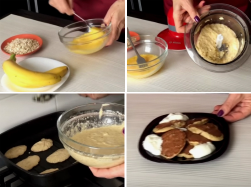 В мисочку отправляем яйцо и с помощью вилки слегка взбиваем. Удобным для вас методом измельчаем бананы, превращаем их в пюре. Переработанные бананы добавляем в миску с яйцом и тщательно перемешиваем всю смесь. Если в бананах останутся всевозможные комочки, это даже хорошо. С помощью кофемолки измельчаем овсяные хлопья, до состояния грубой муки. Все хорошенько перемешали и наше блюдо готово к жарке.