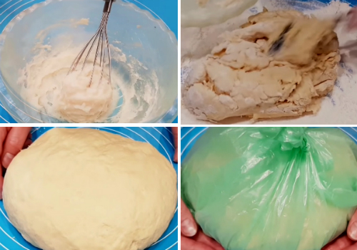 Далее нужно взять просторный пакет, что бы было место для подхода теста, для надежности тесто поместить в два пакета, выпустить воздух и вверху обязательно оставить свободное место. Пакетики завязываем каждый по отдельности. Такое тесто отправляем на ночь в холодильник, а утром делаем свою любимую выпечку.
