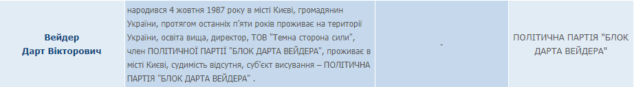 Сообщается, что данный кандидат родился 4 октября 1987 года в городе Киеве, гражданин Украины, в течение последних пяти лет проживает на территории Украины, образование высшее, директор ООО "Темная сторона силы", проживает в Киеве, судимость отсутствует, член политической партии "Блок Дарта Вейдера", от нее же он выдвигается на парламентские выборы.