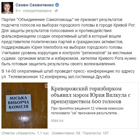 "Объединение Самопомощь" не собирается признавать победу Юрия Вилкула на выборах мэра в Кривом роге. Об этом сообщает народный депутат Украины Семен Семенченко на своей странице в Facebook.