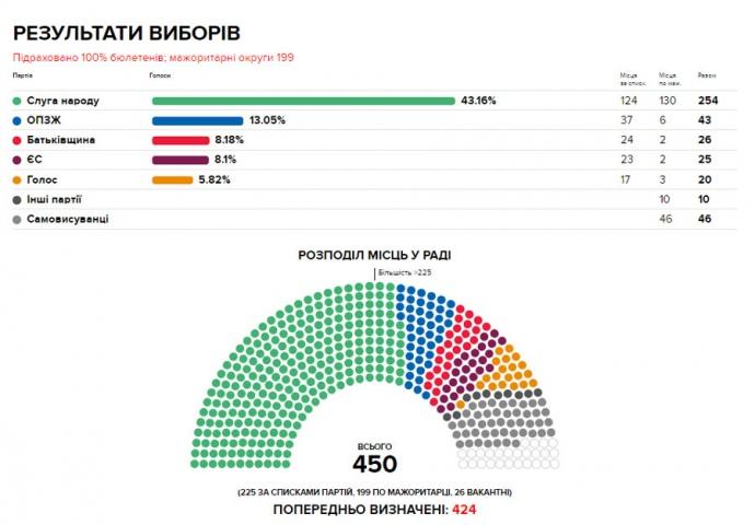 За победителя парламентских выборов, партию "Слуга народа", проголосовали 43,16% избирателей (6 млн 307 тыс. 97 голосов), партию "Оппозиционная платформа – За жизнь" поддержали 13,05% (1 млн 908 тыс. 87 голосов).