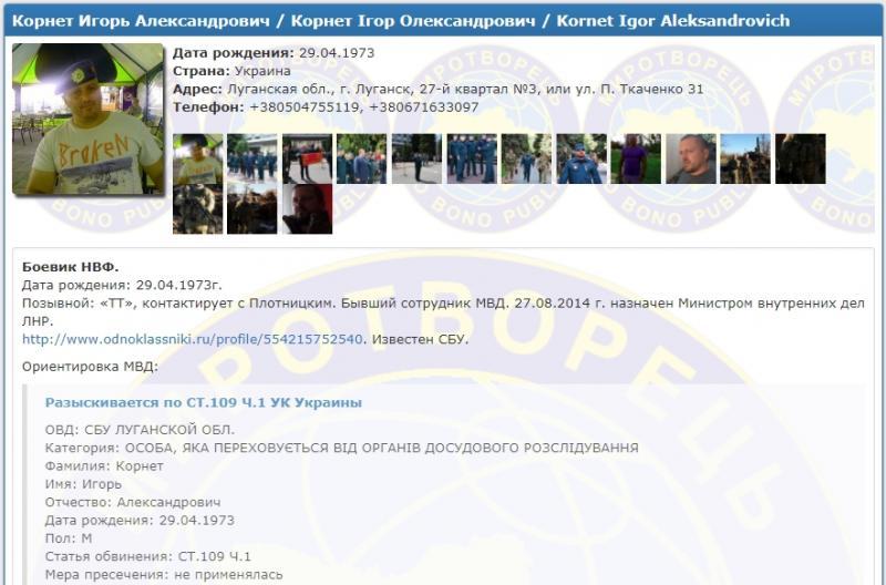В феврале 2015 года Служба безопасности Украины объявила Корнета в розыск за создание террористической группировки, посягательство на территориальную целостность страны и преступные действия с целью свержения конституционного строя.