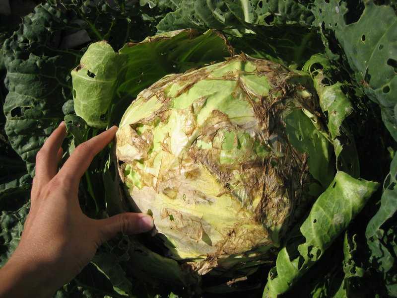 Точечный некроз (неинфекционное заболевание). На внутренней и внешней стороне листьев кочана появляются мелкие, слегка вдавленные серые и темные пятна. Сильно снижаются товарные качества капусты. Поражению растений способствуют высокие дозы азотных удобрений.