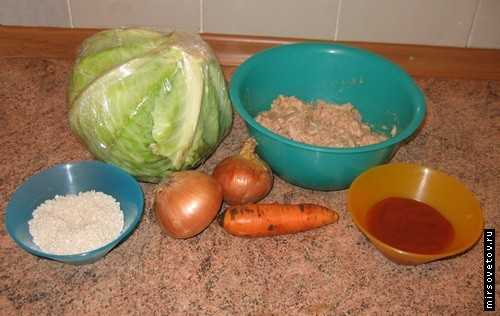Голубцы – продукты: 600 грамм мясного фарша; 200-300 грамм риса; 2 средних размеров луковицы; 1 морковка; 1 крупный кочан капусты (больше килограмма); томат; соль, специи по вкусу.