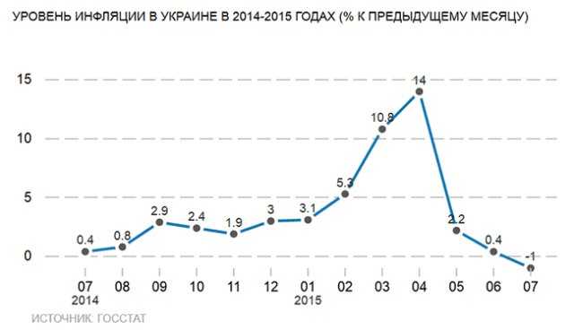 Последний раз дефляция наблюдалась в августе 2013 года. Впрочем, эксперты говорят, что это сезонное явление, и в любом случае из-за скачков цен в марте-апреле украинцев по итогам 2015 года ждет самое высокое удорожание товаров за почти 20 лет.