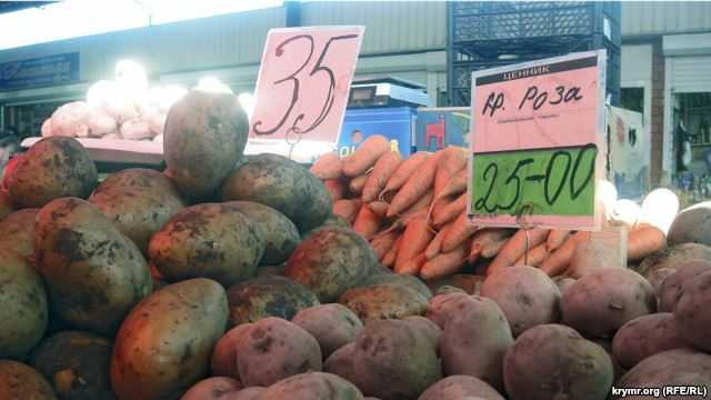 Но картофель 20 сентября после полудня на Центральном рынке Симферополя продавался по цене от 25 до 45 рублей (от 8 до 15 гривен) за килограмм. В августе 2015 средняя цена картофеля была также в пределах 30 рублей (10 гривен) за килограмм.