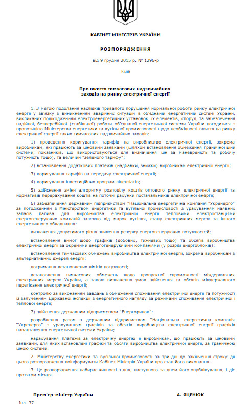 Решением главы Кабинета министров Арсения Яценюка в Украине вводятся чрезвычайные меры на рынке электроэнергии. Подобное решение было инициировано Минэнерго для преодоления последствий длительного нарушения нормальной работы рынка электрической энергии. Об этом идет речь в распоряжении Кабмина № 1296-р от 9 декабря 2015 года.
