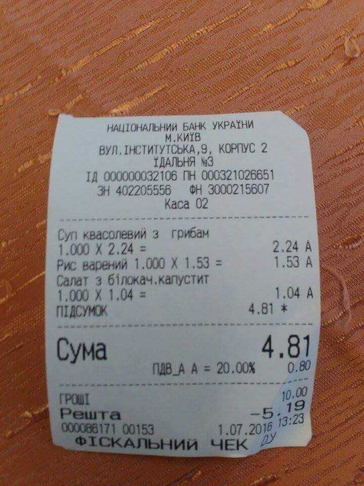 В столовой НБУ можно заказать супчик с фасолью, рис и салат из капусты всего за 5 грн. Об этом сообщили в паблике на Facebook “Я люблю Киев“ и опубликовали фото чека.