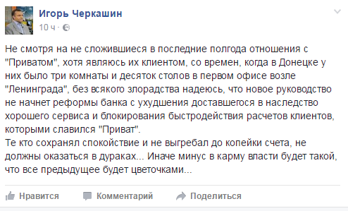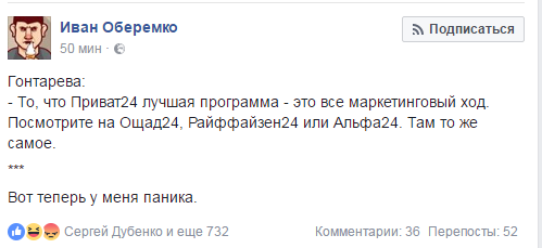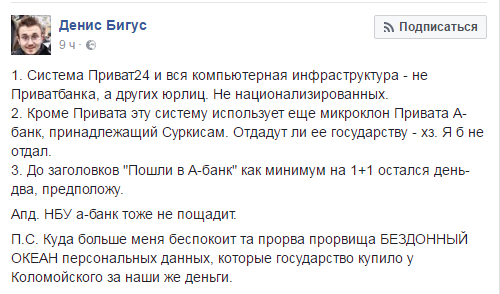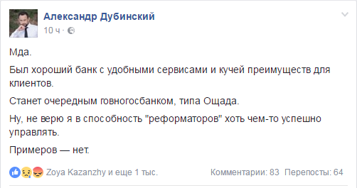 А вот один из постов редактора программы "Гроші" Александра Дубинского, который сравнил "ПриватБанк" с государственным Ощадбанком.