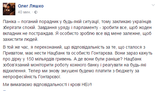 Так, лидер "Радикальной партии Украины" Олег Ляшко обвинил Нацбанк и, в частности, его главу Валерию Гонтареву в появлении проблем у "Привата". Он заявил, что "Радикальная партия" требует "ответственности и крови".