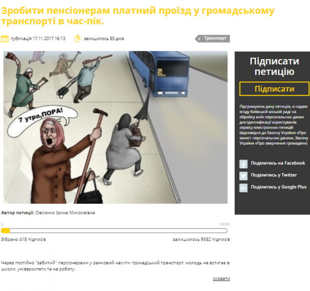 Так, соответствующая петиция появилась на сайте Киевсовета. Ее автор подчеркивает, что в утренние часы пик общественный транспорт забит пенсионерами, из-за чего дети опаздывают в школы, а молодежь – в вузы и на работу. В связи с этим столичным властям предлагается сделать для пенсионеров платный проезд в наиболее загруженные часы. Для рассмотрения петиции необходимо набрать 10 тысяч голосов, но пока их чуть более 400.