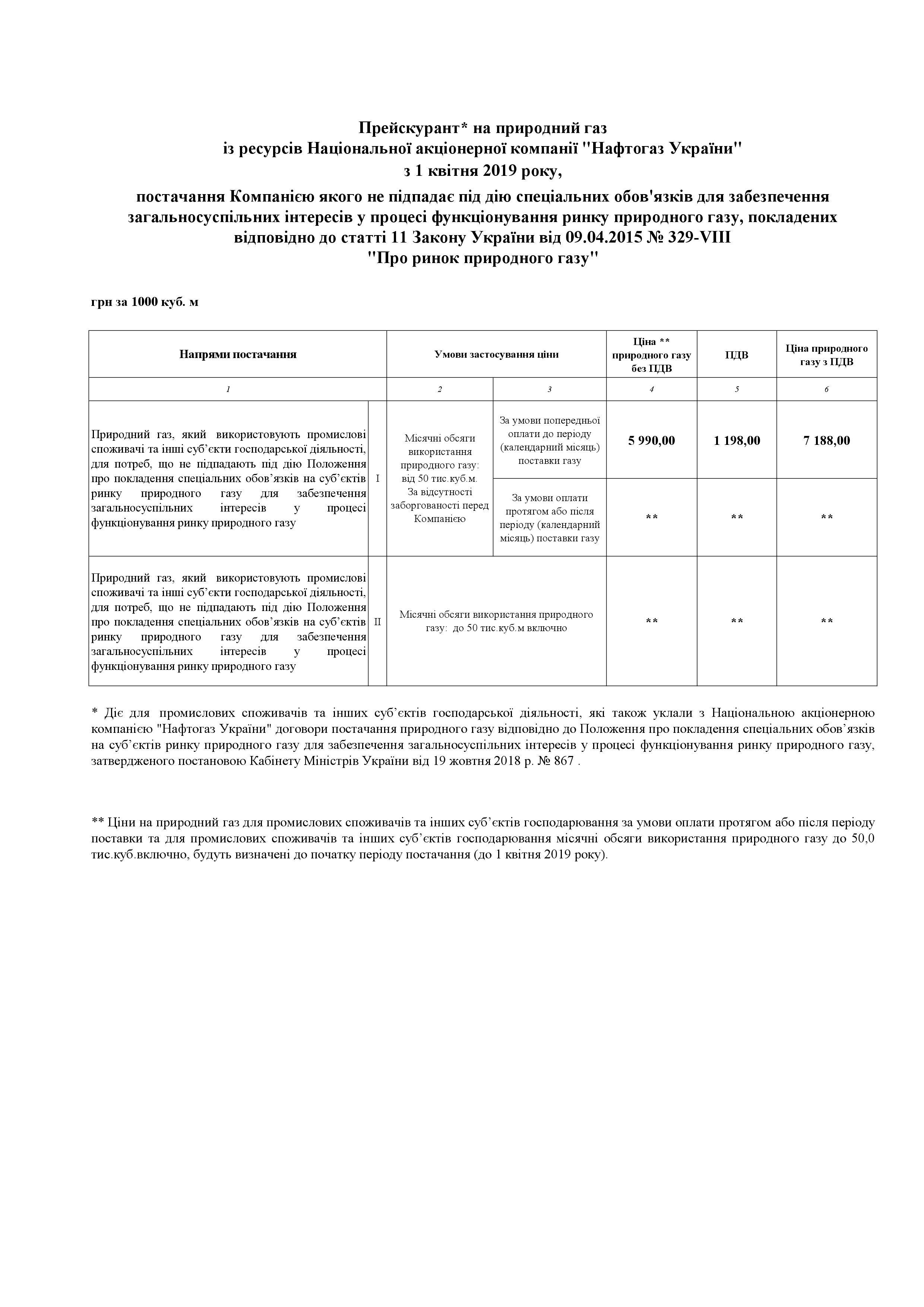 Ценовые предложения на природный газ, которые будут действовать с 1 апреля 2019 года, для промышленных потребителей, работающих на условиях оплаты в течение или после периода поставки, Нафтогаз дополнительно обнародует до конца месяца с учетом рыночной конъюнктуры.