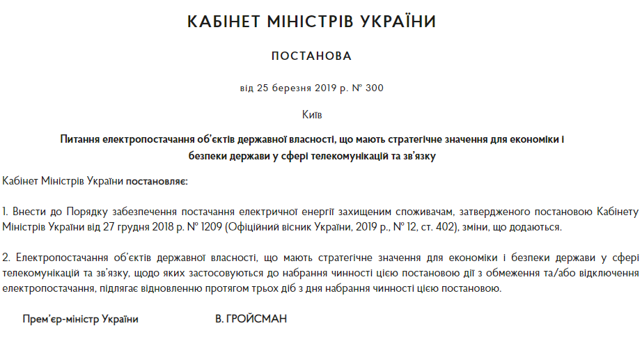 Кабинет министров Украины запретил ограничивать электроснабжение объектам государственной собственности, имеющих стратегическое значение для экономики и безопасности государства в сфере телекоммуникаций и связи.