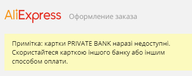 У держателей карт ПриватБанка оформление заказа обрывается на стадии оплаты. Банк присылает сообщение, что якобы превышен дневной лимит операции. При этом на сайте AliExpress при попытке оплатить товар появляется сообщение, что карты ПриватБанка недоступны.