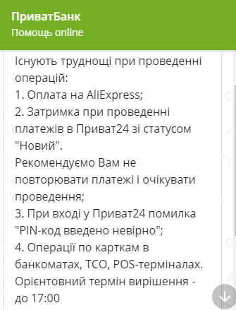 Техподдержка ПриватБанка сообщает, что наблюдаются трудности с оплатой на AliExpress, операциями в банкоматах, ТСО, POS-терминалах, а также задержка проведения платежей в Приват24 со статусом "Новый". Пользователям последней категории рекомендуют не повторять платежи и ожидать их проведения.