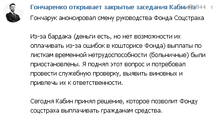 "Гончарук анонсировал смену руководства Фонда соцстраха. Из-за бардака (деньги есть, но нет возможности их оплачивать из-за ошибок в кошторисе Фонда) выплаты по листкам временной нетрудоспособности (больничные) были приостановлены. Я поднял этот вопрос и потребовал провести служебную проверку, выявить виновных и привлечь их к ответственности", - написал Гончаренко.