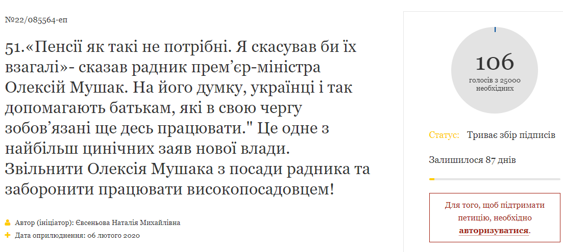 Теперь украинцы требуют уволить Мушака с должности советника премьера и запретить ему занимать высокие посты. На сайте президента опубликована соответствующая петиция, но пока она не набрала существенного количества голосов.