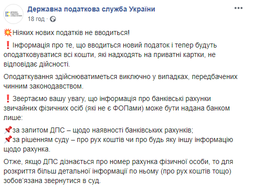 "Никаких новых налогов не вводится! Информация о том, что вводится новый налог и теперь будут облагаться все средства, которые поступают на частные карты, не соответствует действительности", - заверили в пресс-службе Налоговой службы Украины.