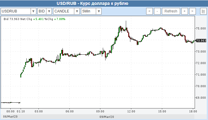 Российская валюта резко упала примерно на 10%, минимальный курс сегодня превысил отметку в 75 рублей за 1 доллар США. Сейчас рубль колеблется на уровне около 74 руб./долл.