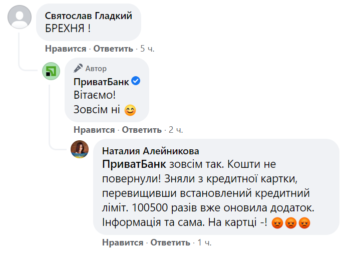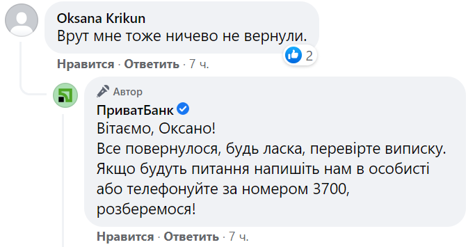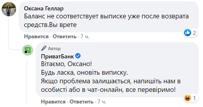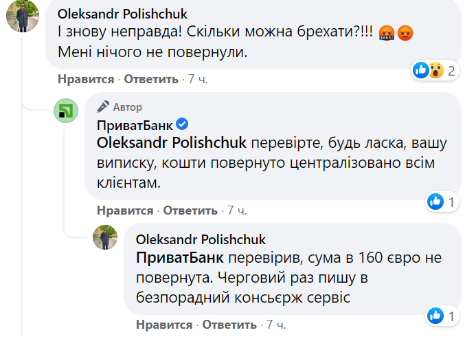 В комментариях некоторые пользователи пишут, что деньги им не вернули или вернули не в полном объеме. В "ПриватБанке" в таких случаях советуют обновить выписку, а если это не решит проблему, - обратиться в службу технической поддержки.