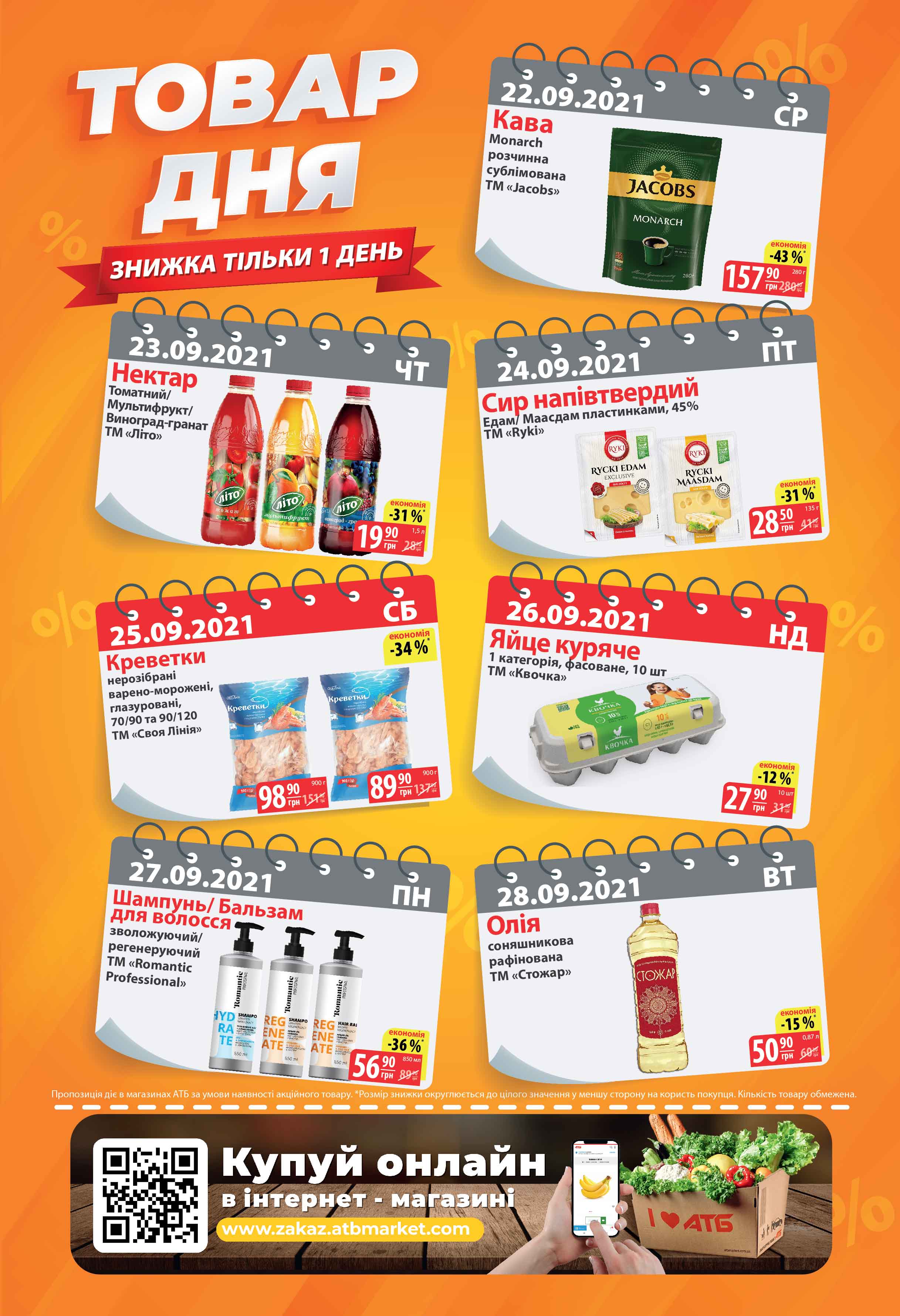 Акция "Товар дня" будет действовать с 22 по 28 сентября. В течение этого времени, в определенный день, некоторые товары можно купить с хорошей скидкой.