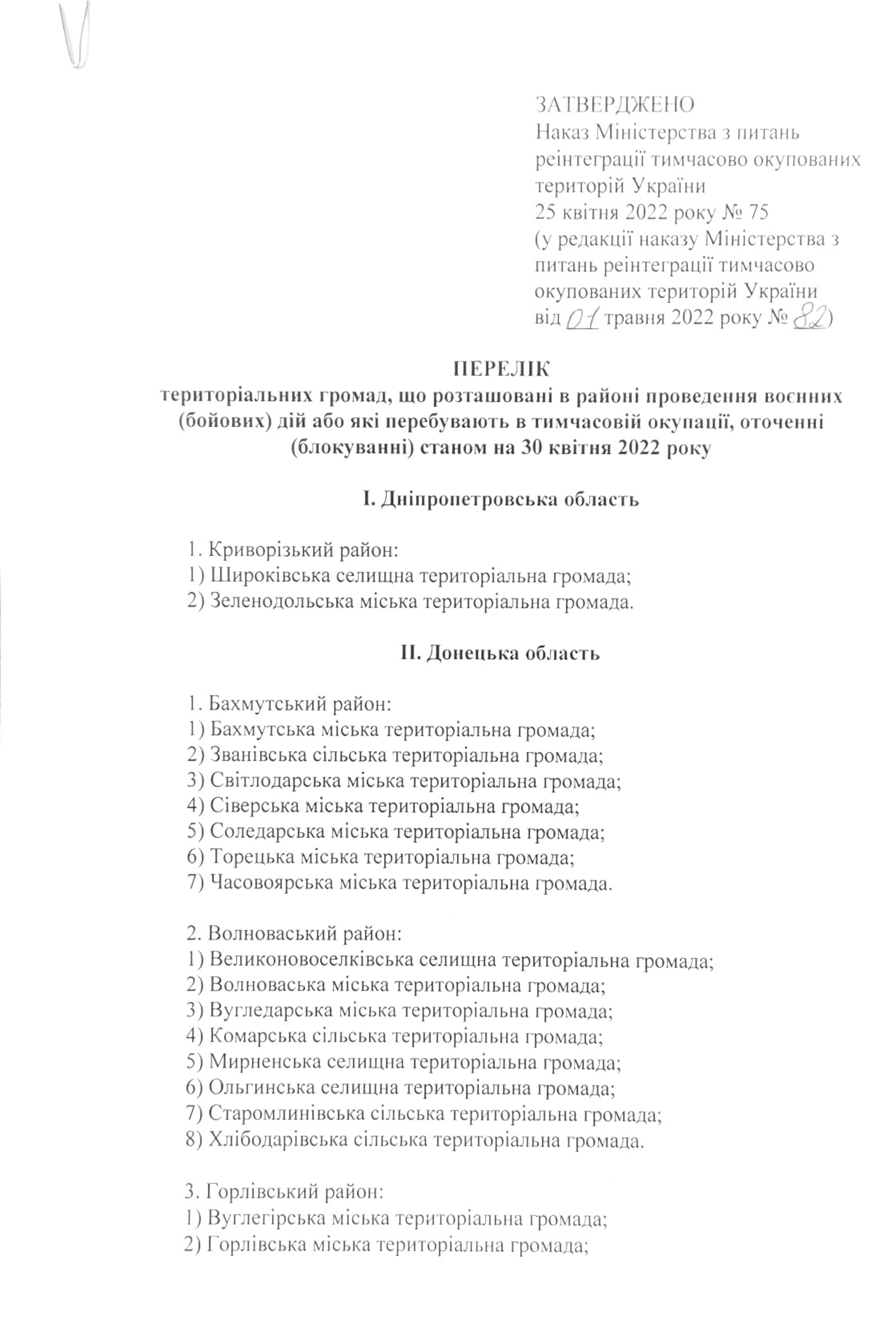 По состоянию на 30.04.2022 года обновленный перечень территориальных общин, расположенных в районах проведения военных (боевых) действий, или находящихся во временной оккупации, окружении (блокировании), добавились 11 общин Николаевской области.