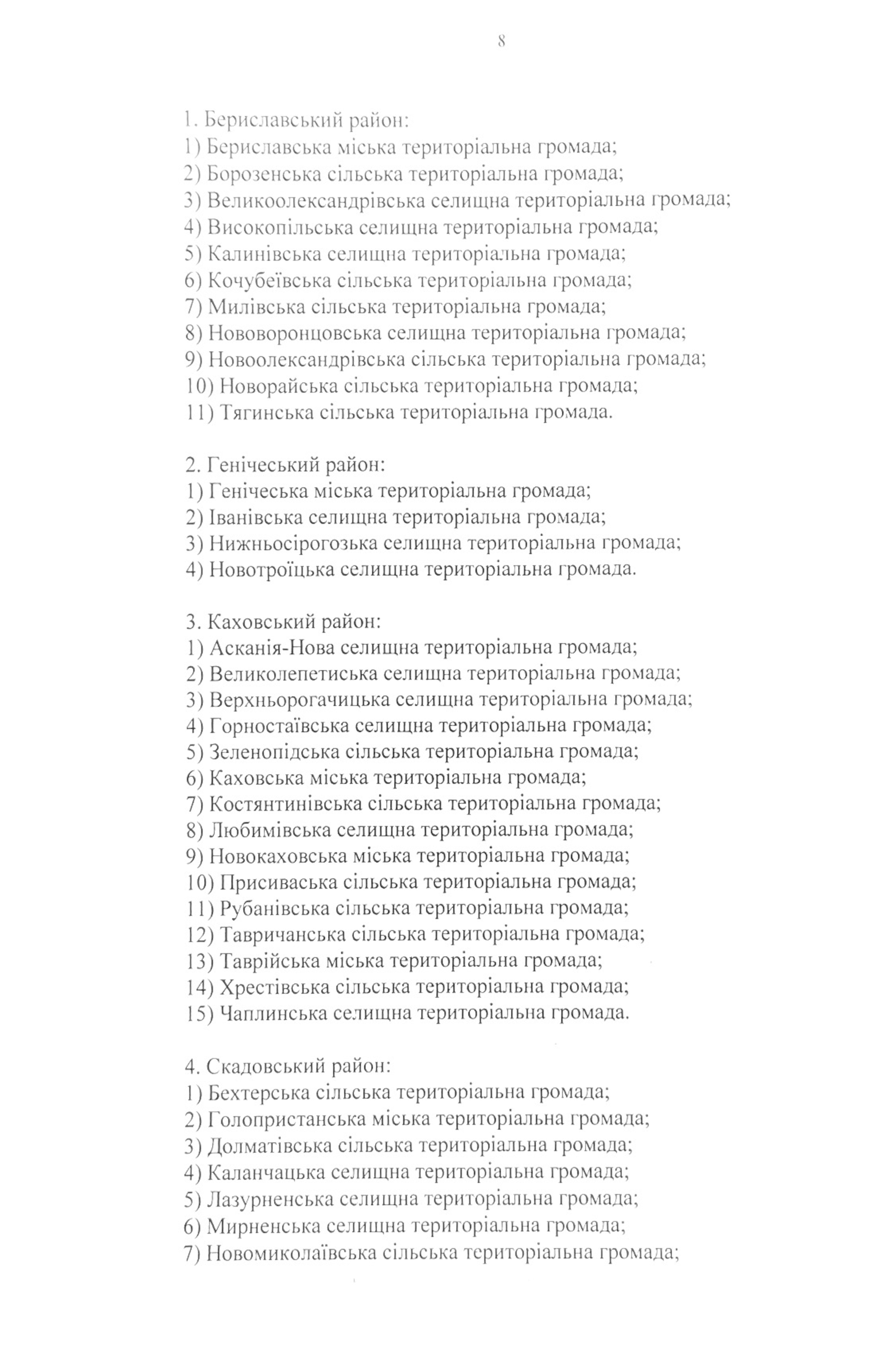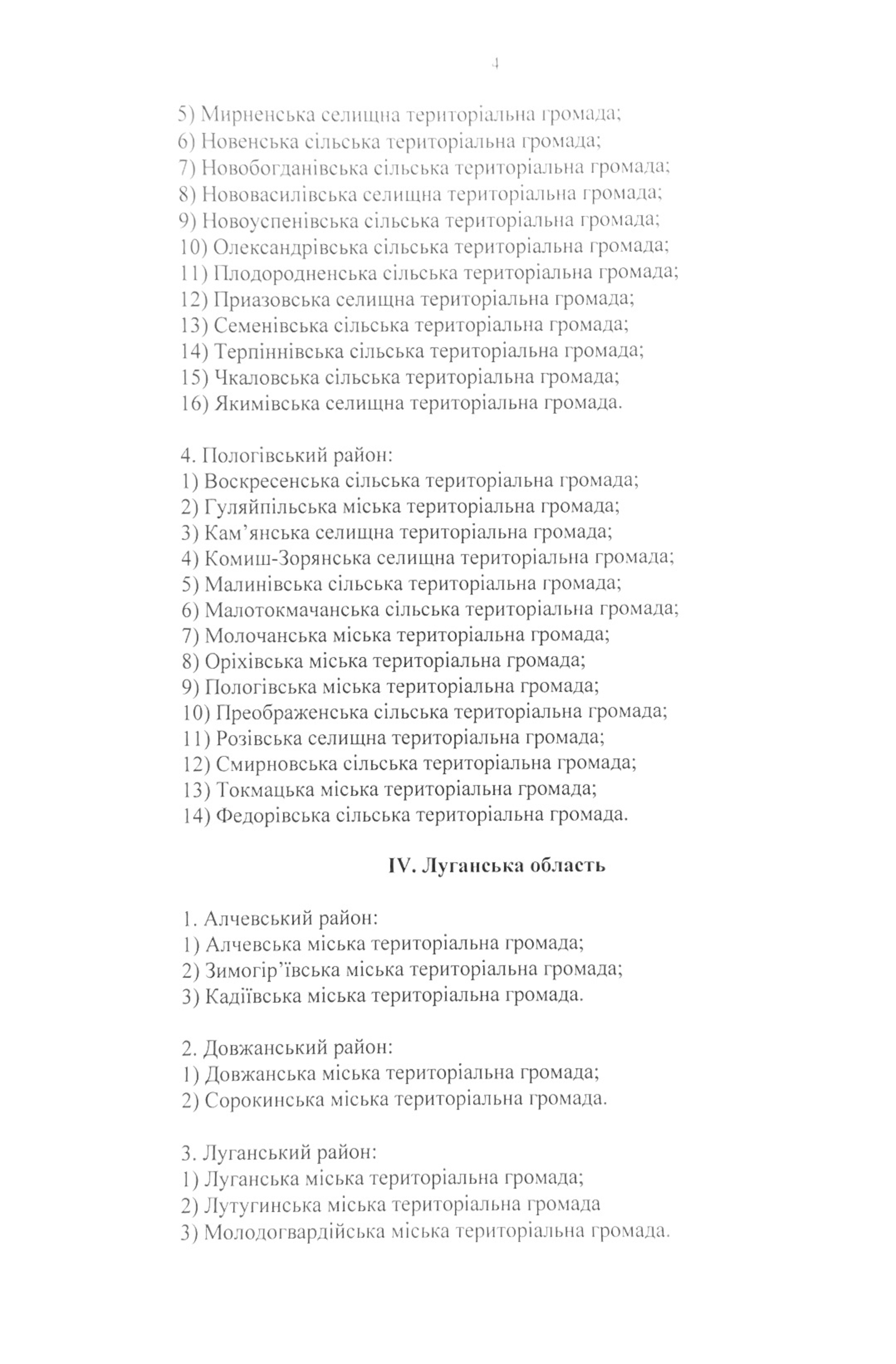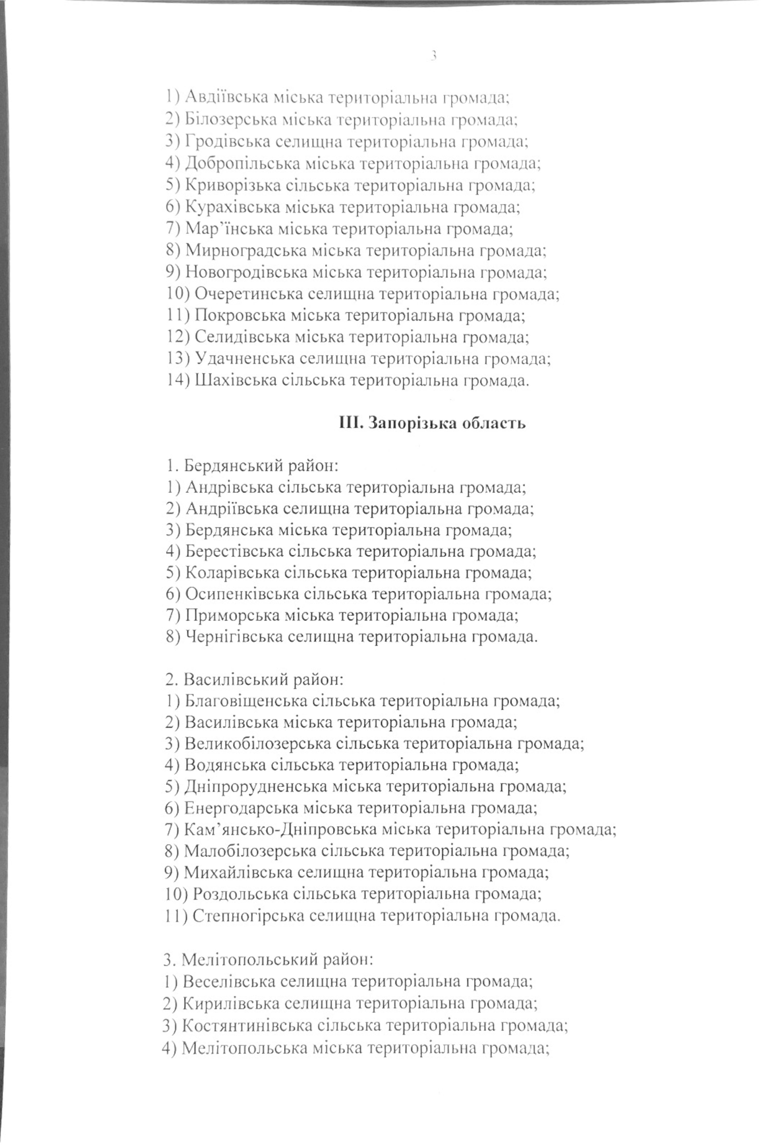 Всего в список вошли 8 областей. Это территориальные общины Днепропетровской (2 общины), Херсонской (49 общин), Харьковской (51 община), Николаевской (15 общины), Донецкой (66 общин – все), Луганской (37 общин – все), Одесской (1 община) и Запорожской (49 общин) областей.