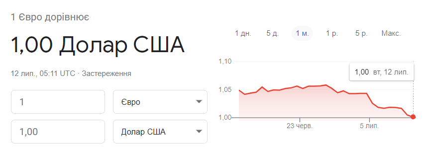 Падение евро до 20-летнего минимума связано с остановкой Северного потока-1. По состоянию на 12 июля обменный курс евро и доллара составляет 1:1. Но по курсу НБУ 100 долларов все еще равны 98,5 евро.
