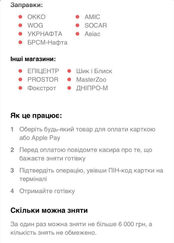 Сети супермаркетов, где можно снять наличные: Novus, Varus, "Делви", "Лоток", "АТБ", "Сильпо", "Точка", "Траш", "Сим23", Roshen, "Фора", "Свой Маркет" , FOZZY, "Коло", "Ашан", Torba, "Посад", Winetime.