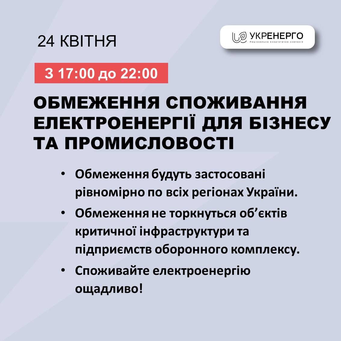 Как сообщается, 24 апреля, с 17:00 до 22:00 будут применены контролируемые ограничения энергоснабжения промышленных потребителей (графики ограничения мощности).