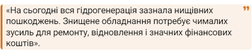 Как сообщают в "Укргидроэнерго", на сегодняшний день вся гидрогенерация получила сокрушительные повреждения. Отмечается, что уничтоженное оборудование требует больших усилий для ремонта, восстановления и значительных финансовых средств.