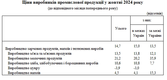 По данным статистического ведомства, в производстве пищевых продуктов, напитков и табачных изделий цены выросли на 14,7%, в том числе в пределах Украины - на 15,0%, за пределами Украины - на 13,5%.
