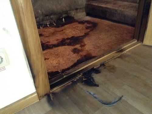 Неизвестные просверлили дыру в двери в техническое помещение, где размещены электрощитовые и ключевые технические узлы помещения. Через нее они проложили шнур, пропитанный горючей жидкостью, который затем подожгли.