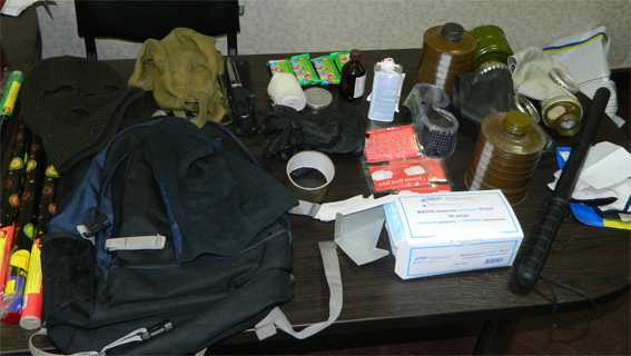 При осмотре у них было обнаружены и изъяты резиновые дубинки, ножи, пиротехнические установки, медицинские маски, противогазы, вязаные шапки с прорезями для глаз, бутылки с легковоспламеняющейся смесью, скотч.