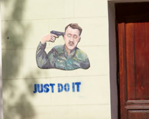 Третья работа изображала Игоря Стрелкова с приставленным к виску пистолетом и сопровождалась подписью "Просто сделай это!".