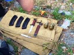 При осмотре транспортных средств участников ДТП, а именно «Mitsubishi Galant», в багажном отделении правоохранители обнаружили 2 гранаты РГД-5, 3 автоматных рожка и 90 шт. патронов калибра 5.45 мм.