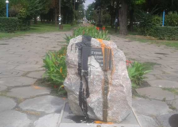 28 августа 2014 года в 11:15 по телефону на линию «102» поступило анонимное сообщение о том, что на площади Ленина в г. Днепродзержинске неизвестный повредил и облил краской черного и желтого цветов мемориальный знак «Герои не умирают».