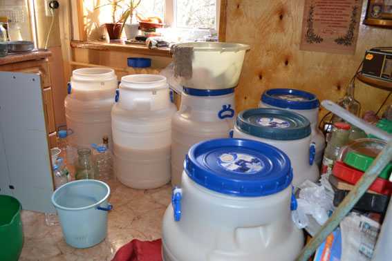 6 пластиковых 80-литровых бочек с брагой общим объемом около полутонны и 55 литров самогона в пластиковых бутылках.