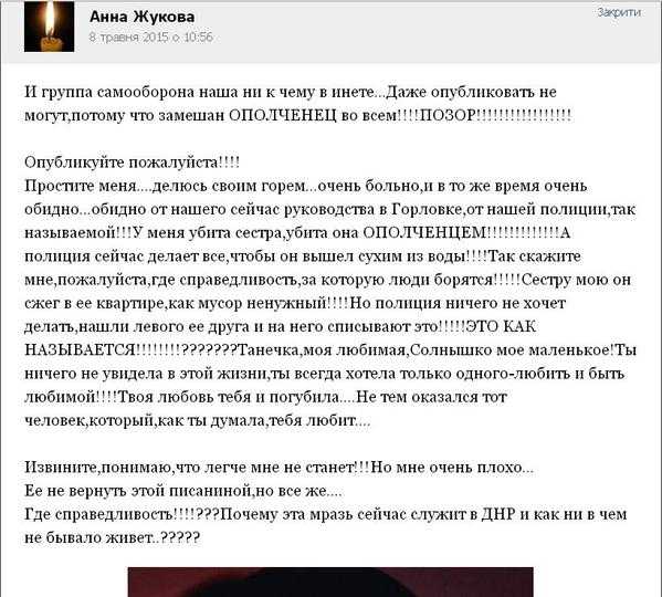 О жестокой расправе сообщила сестра погибшей девушки. Сообщение о гибели девушки от рук своего молодого человека в социальной сети разместила сестра убитой Анна Жукова. По ее словам, свой пост она также пыталась разместить в группе «Самооборона Горловки», но там он был быстро удален администраторами, так как группа управляется сепаратистами.