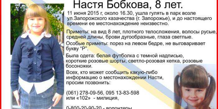 13 июня в Запорожье нашли тело 8-летней девочки Анастасии Бобковой, ранее объявленной в розыск.