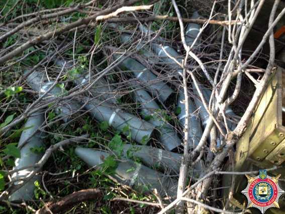 В лесополосе под грудой сухих веток было обнаружено больше 20 ящиков с боеприпасами. Всего изъято 57 снарядов калибра 152 мм.