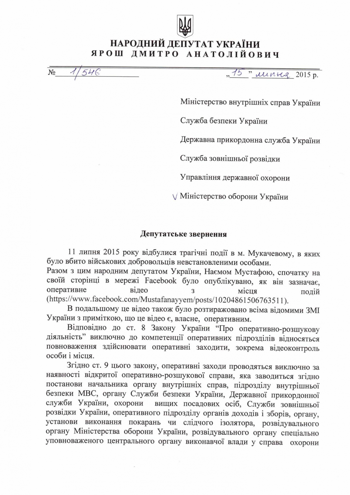 Дмитрий Ярош обратился в СБУ с просьбой разобраться, откуда народный депутат Мустафа Найем получил оперативное видео событий в Мукачево.