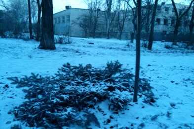 На аллее у средней школы №25 в Жовтневом районе браконьеры приступили к вырубке елок. Им не помешала обработка молодых деревьев спецсредством.