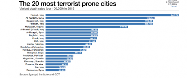 Обзор террористической угрозы измерялся в более чем 2100 городах мира на основании показателей количества насильственных смертей (на 100 тыс. человек).