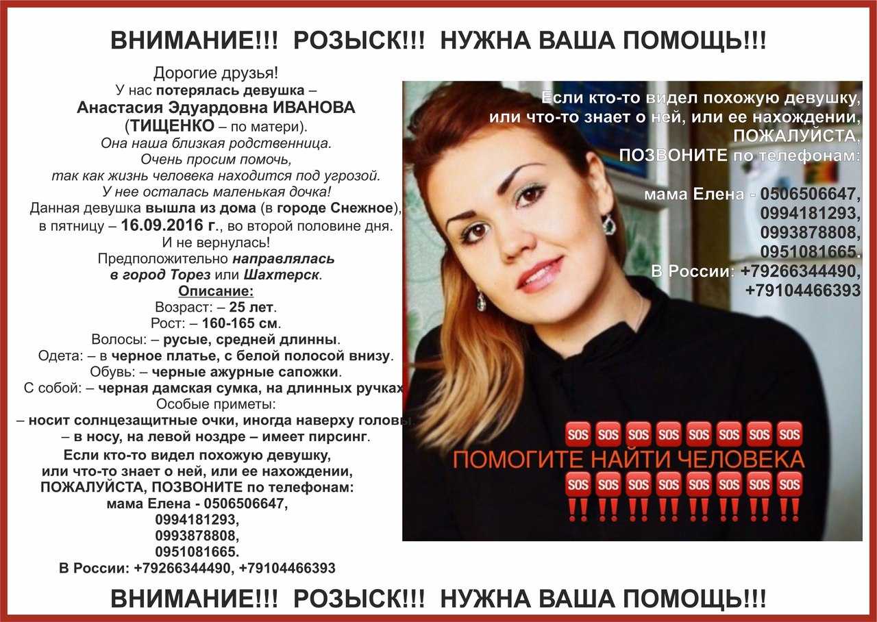 Ранее в соцсети ВКонтакте появились объявления с просьбой о помощи в поиске 25-летней жительницы оккупированного Снежного Анастасии Ивановой. В частности сообщалось, что она вышла из дому 16 сентября и не вернулась.