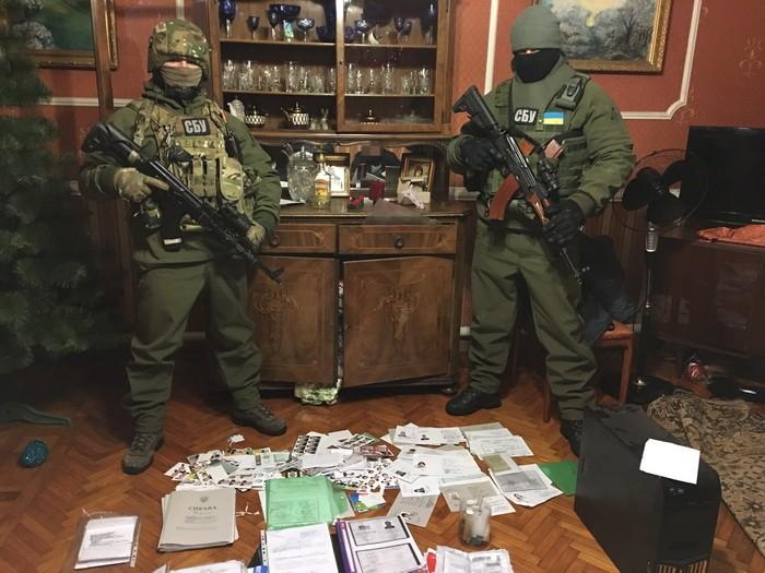 Во время обыска в доме сообщницы террористов оперативники спецслужбы обнаружили 16 паспортов граждан Украины с признаками подделки; устройство для изготовления гербового оттиска на фотографиях в паспортах; незаполненные бланки с гербовыми печатями справок о регистрации временно перемещенных лиц, свидетельства о рождении лица, заявлений о потере или похищении паспорта, назначения всех видов социальных платежей; 40 готовых справок временно перемещенных лиц и 60 комплектов фотографий для вклеивания в документы.