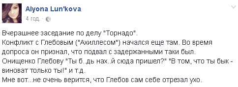Лунькова, описывая подробности заседания суда, уточнила, что Глебов дал показания, согласно которым, батальон действительно имел подвал, где удерживали задержанных. Онищенко резко начала нецензурно выражаться в адрес Глебова, назвал того "быком" и заявил, что тот сам во всем виноват.