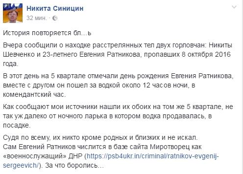 "Вчера сообщили о находке расстрелянных тел двух горловчан: Никиты Шевченко и 23-летнего Евгения Ратникова, пропавших 8 октября 2016 года.