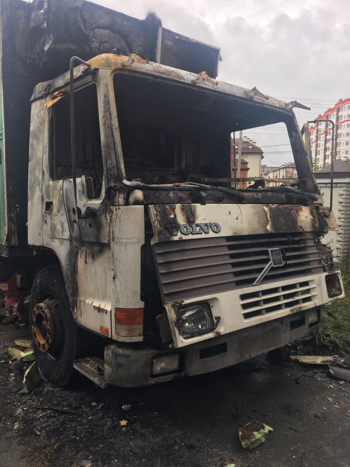 Как написал волонтер, в кабину грузовика бросили бутылки с зажигательной жидкостью.